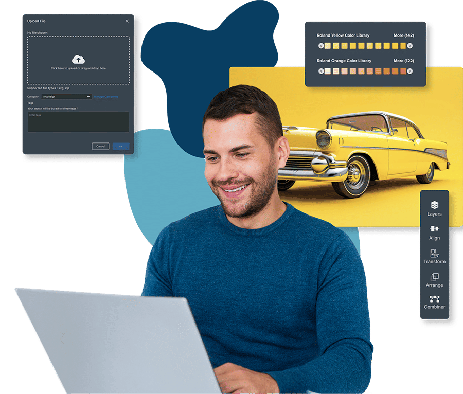 O Roland DG Connect Designer une design e produção em um único ambiente. Desenvolvido para todos os níveis de usuários, ele oferece ferramentas intuitivas e uma biblioteca de fontes, formas e imagens, facilitando a criação de designs profissionais por você.